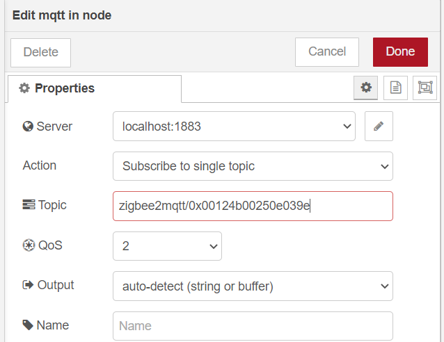 A guide that describes the basics of Node-RED use in the Ampio system is available here: Integration of the Ampio system with Node-RED. After adding secondary devices, data from the MQTT Ampio can be received. Topic on which the device is broadcasting can be viewed in a terminal via an SSH connection. In this case, it is the main topic and ID of the added device: zigbee2mqtt/0x00124b00250e039e.