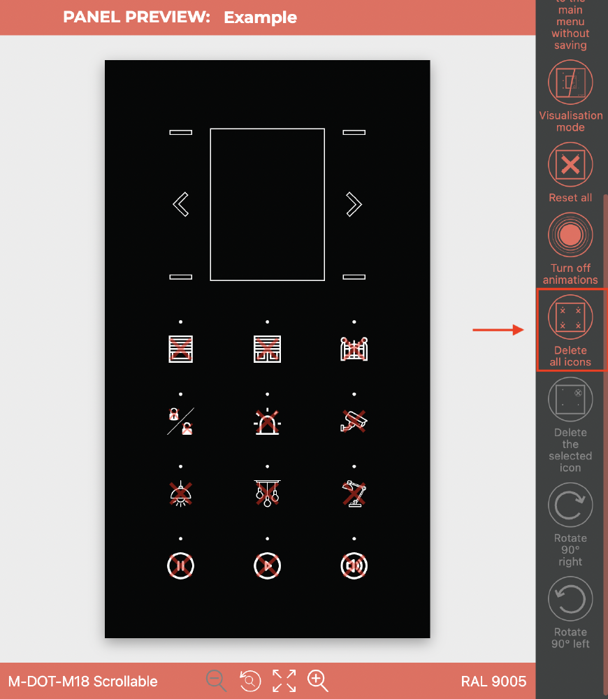 Deletable status LEDs present in the project are highlighted in green. When the cursor hovers over such a field, a minus symbol appears on it. By clicking on such a field, the status LED (dot or selected icon) will be deleted.