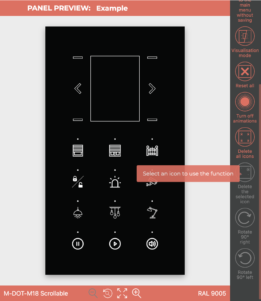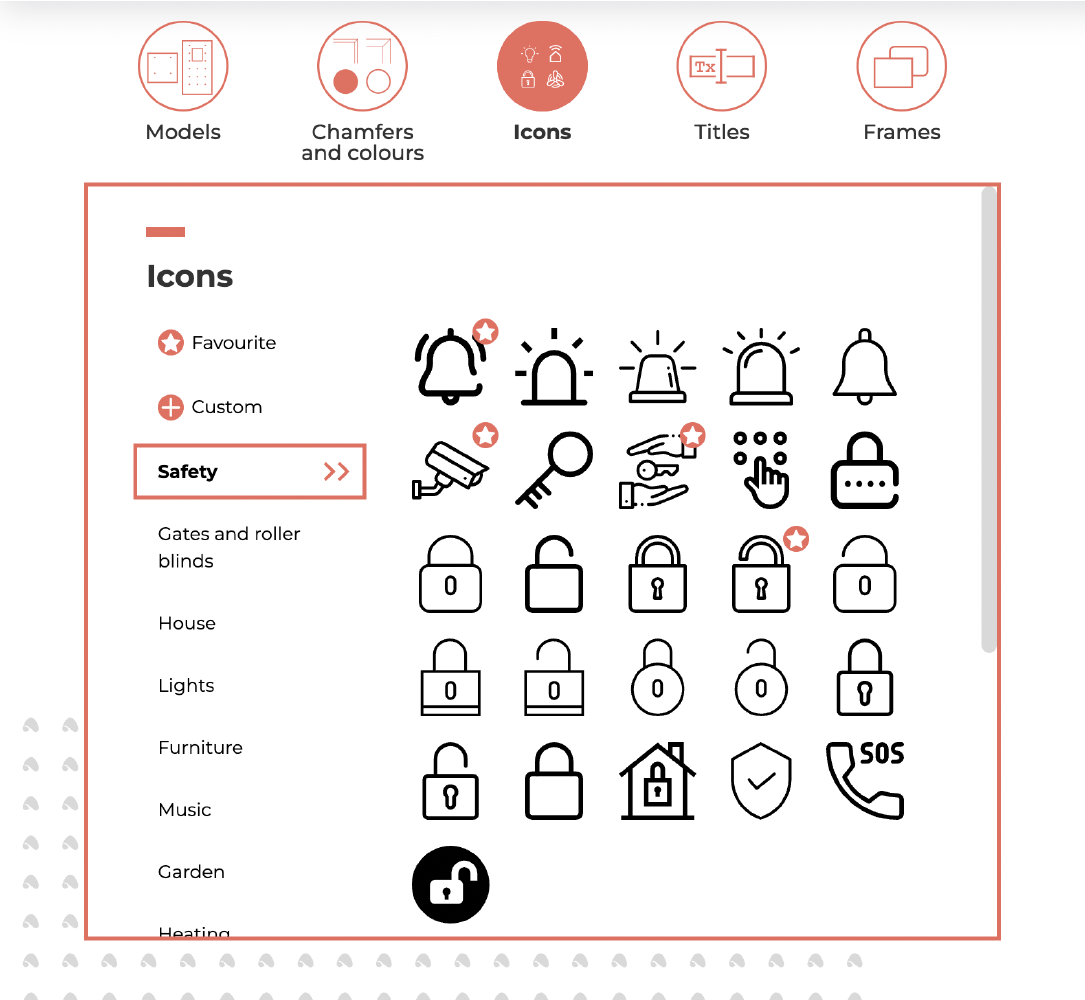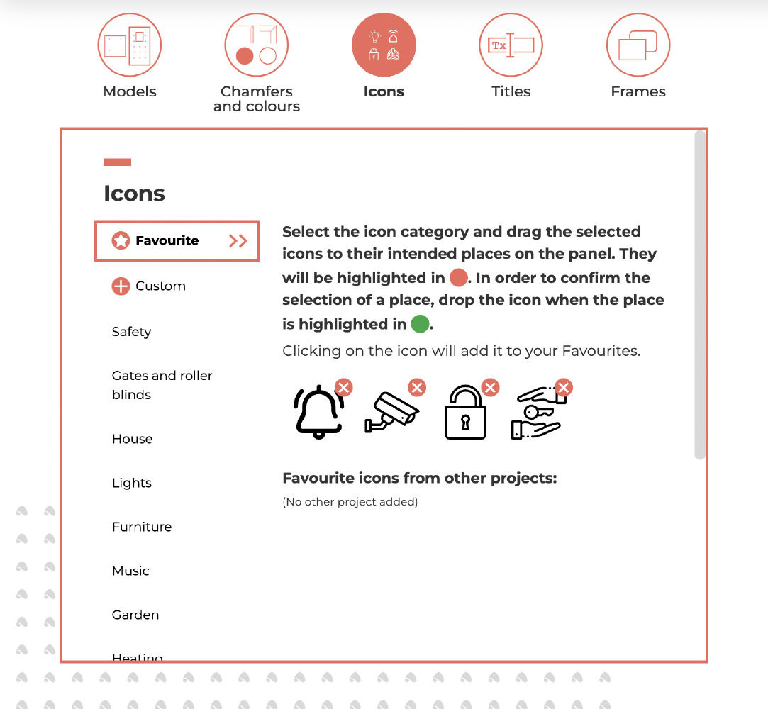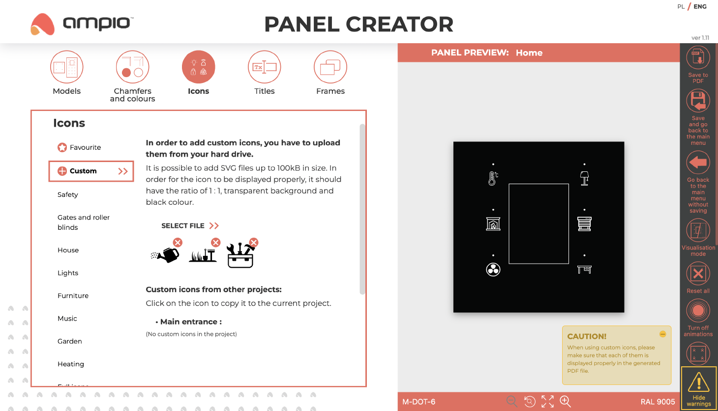 The Custom section allows you to personalise your project with your own icons by uploading them to the creator from your computer’s hard drive. It is possible to add files with SVG extension up to 100kB in size. For the icon to display correctly, it should have an aspect ratio of 1 : 1, a transparent background and a black colour. As with Favourite Icons, it is also possible to use Custom Icons from other projects added to the Panel Creator. Any icon added by the user is converted by external software to match its parameters to those required for the Panel Creator, but when using a Custom Icon, it is important to check each time that it displays correctly on the generated PDF file. A warning indicating this necessity is displayed when a Custom Icon is added.