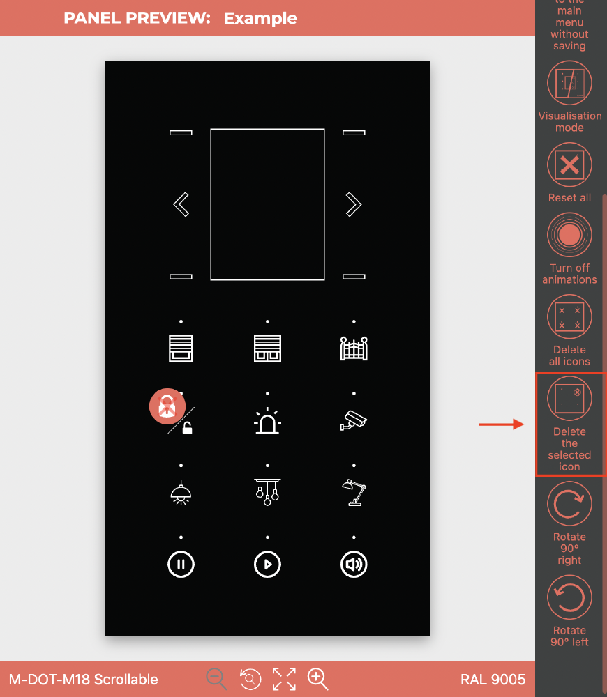 Icons can be placed on the panel by dragging and placing them on one of the available fields, which highlight when an icon is placed over them. Each of these fields has space for a full-size icon and a light point above the icon. If an icon is placed in a field occupied by another icon, it will be replaced. The deletion of a previous icon is indicated by displaying an X on the icon before dropping a new icon.