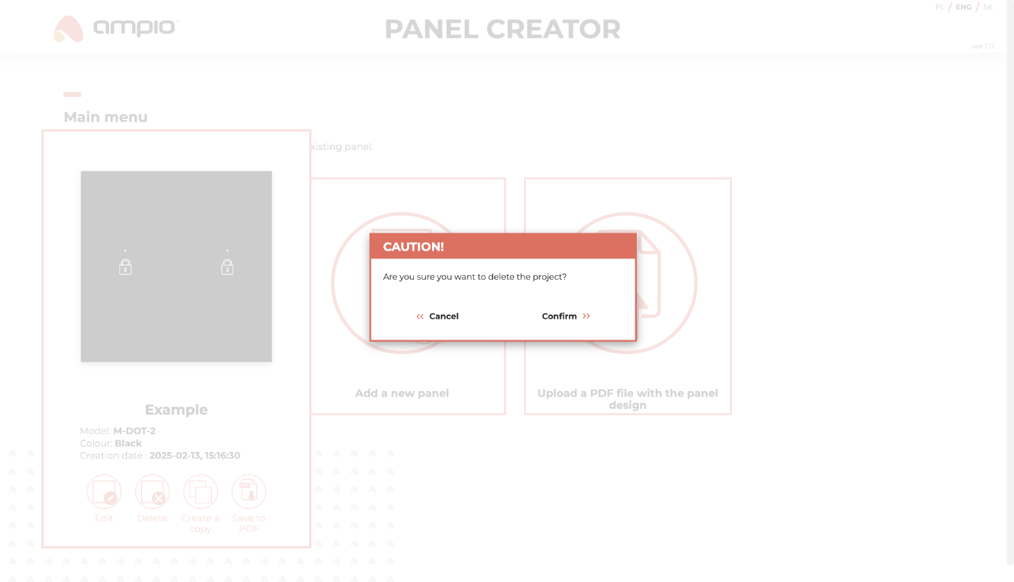 Each project can be edited, deleted, duplicated or saved as a PDF file from the main menu. The use of functions that cause irreversible changes is protected by relevant alerts.