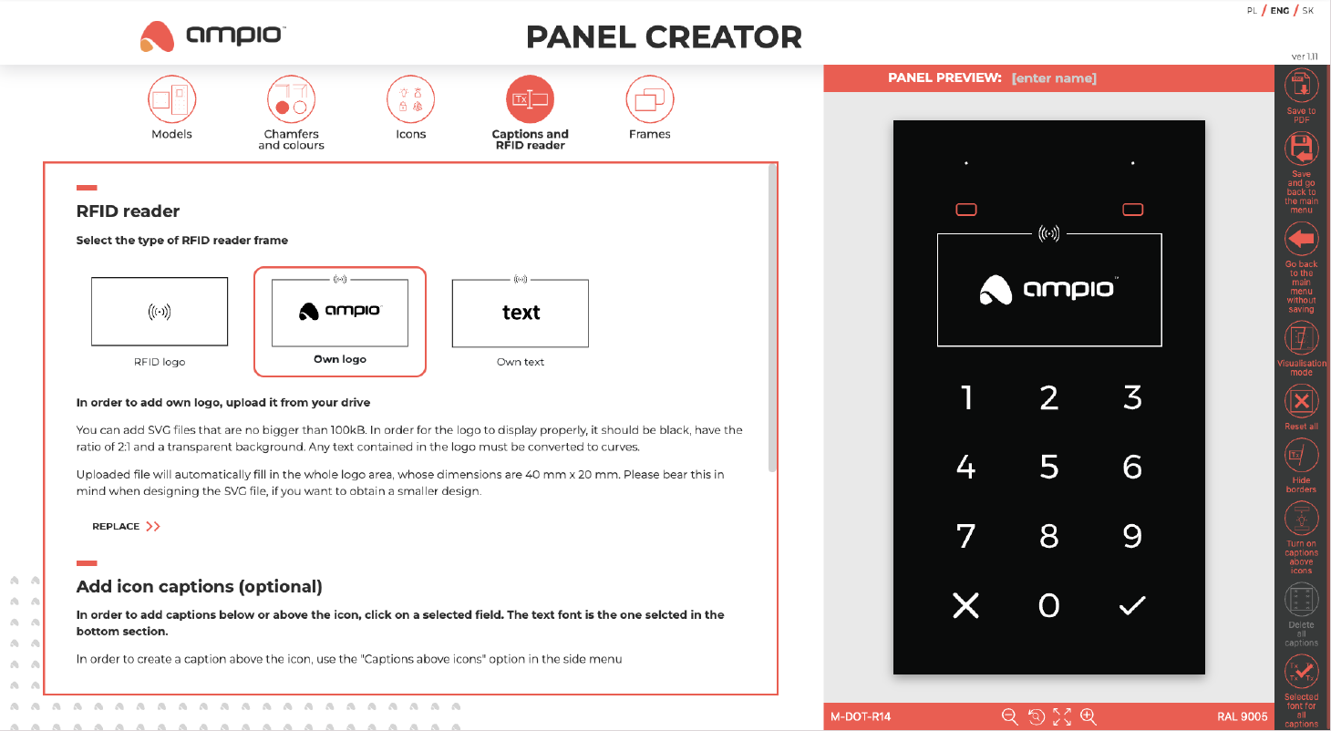 For selected models, the Captions tab also allows the configuration of an RFID reader. By default, the reader has a full frame and an RFID logo in its centre, but it is possible to add your own logo or text there.