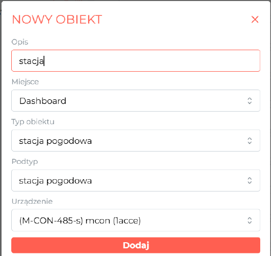 Aby obiekt stacji wyświetlić w aplikacji mobilnej przechodzimy do zakładki APLIKACJA i w wybranym pomieszczeniu tworzymy obiekt poprzez + i Dodaj nowy obiekt.