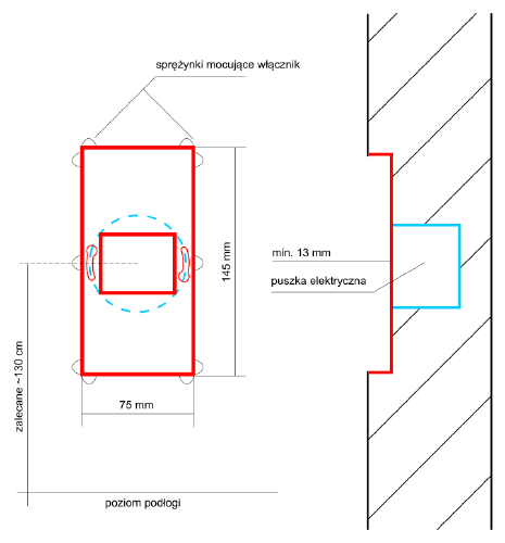 1. Puszkę elektryczną (na schemacie kolor niebieski) osadzamy około 9 do 14 mm głębiej tak, aby krawędzie blaszki prowadzącej włącznika nie wystawały nad tynk.