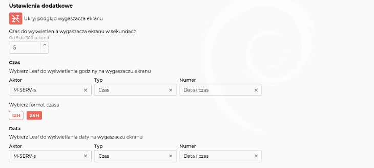 Wygaszacz wyświetla datę i godzinę, które należy powiązać z odpowiednimi leafami z serwera.