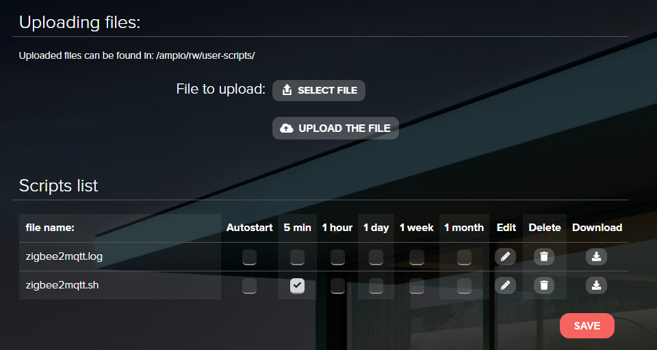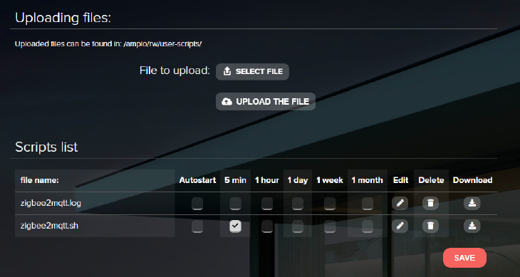 For the application to launch automatically after a power supply reboot, a suitable script must be written. Open the SYSTEM tab in the www interface of M-SERV and go to SCRIPTS. Download the attached file zigbee2mqtt.sh. Upload it by clicking on SELECT FILE, and then UPLOAD THE FILE. Then, tick the 5 min box next to the correct script and click SAVE.
