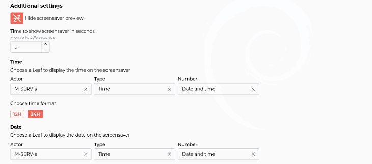 The screensaver displays the date and time, which must be linked to the appropriate leafs from the server.