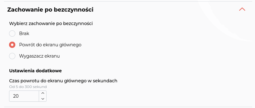 Opcja „Powrót do ekranu głównego” pozwala ustawić czas, po którym – w przypadku braku interakcji – panel automatycznie przełączy się na pierwszy ekran.