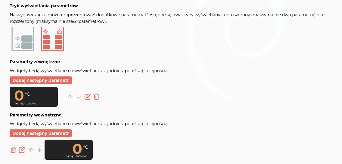 Konfigurując parametry najpierw wybieram jeden z dwóch trybów wyświetlania parametrów. Następnie dodajemy interesujące nas parametry (zewnętrzne bądź wewnętrzne). Konfiguracja parametrów jest zbliżona do konfiguracji widgetów wyświetlania. Robimy to klikając w ikonę ‘kartki z długopisem’ znajdującej się obok interesującego nas parametru. W oknie konfiguracji parametry możemy dostosować: